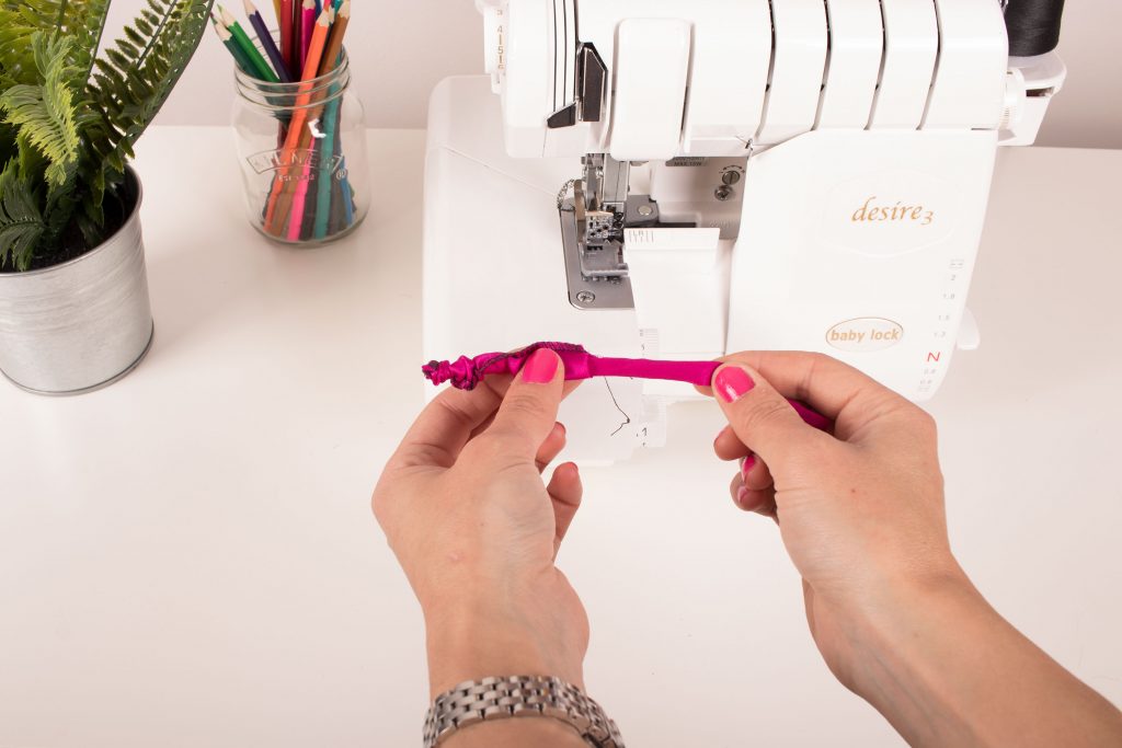 Turning straps through, especially narrow rouleau straps, can be time consuming and frustrating, unless you use this great overlocker tip.