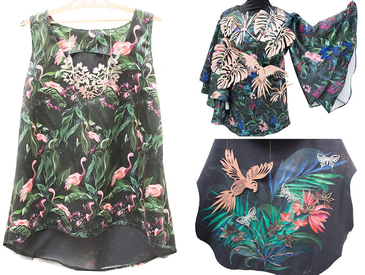 Another super vibrant collection inspired by nature, I could not get enough of these pieces! I loved the stark contrast of the bright colours against the dark background and experimentation with different materials. The digital print and laser cut designs translated beautifully onto metal, leather and the lightweight fabrics used.