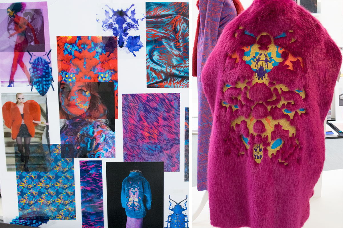 I was simply overwhelmed by the ingenuity of this project. I was immediately drawn to the embroidered faux furs. The bold colours and inspired designs were like a flame to a moth. Then my practical sewing brain took over and I had to ask Anne how they created these pieces. Traditional and digital embroidery methods were used. We talked about the desire to experiment in the name of producing such exquisite work outweighing any concerns over how the embroidery machine would cope!