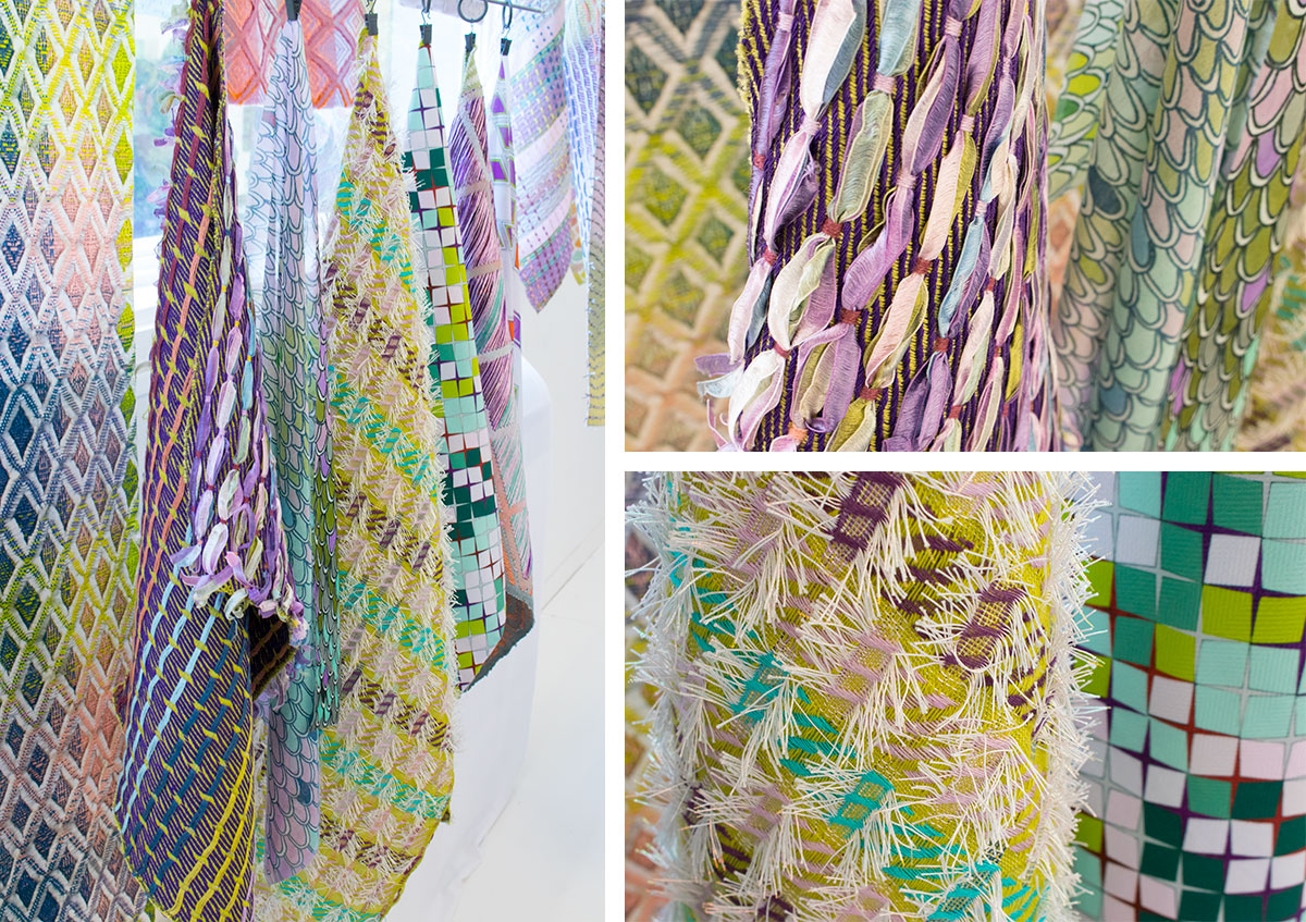 Reflective, mirrored and elasticated yarns were used alongside stainless steel silk and cut shiny viscose to create this shimmering collection. The combination of different textures worked so well together and would bring a contemporary edge to any interior.
