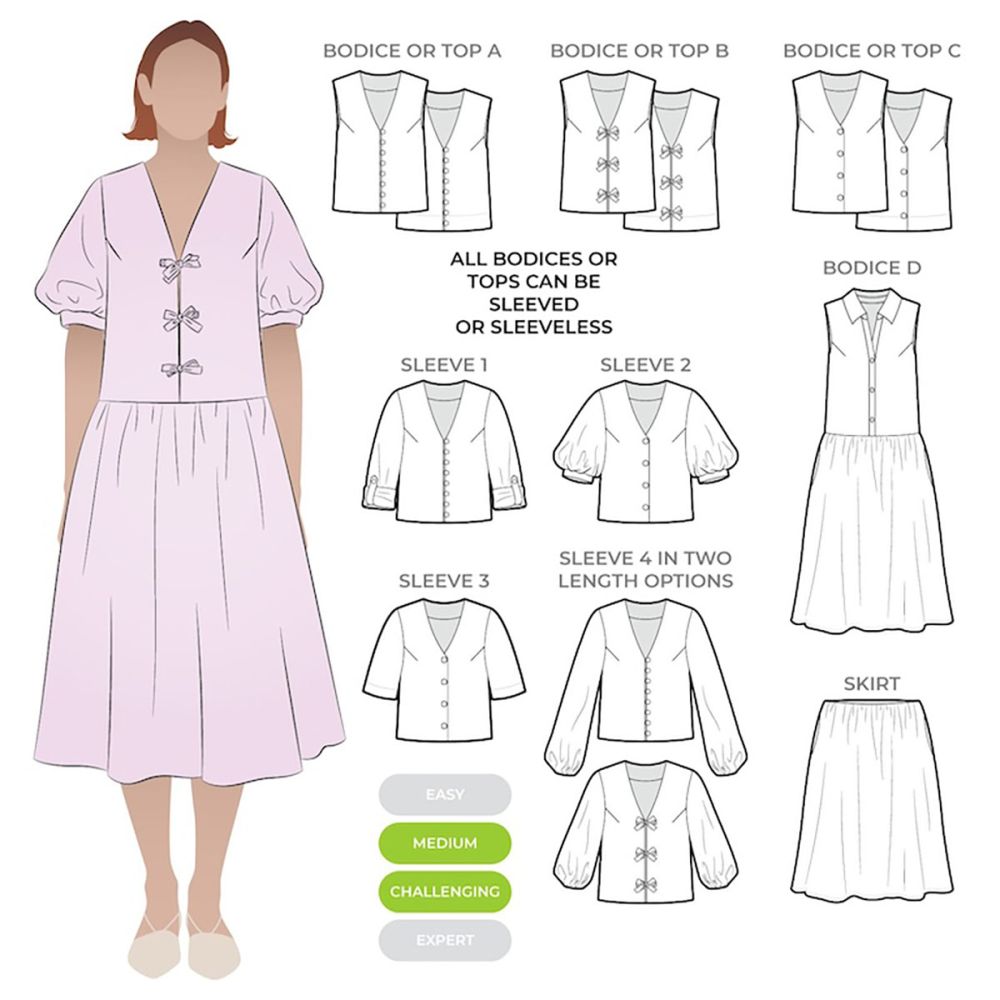 Low waisted dress and top with four bodice and sleeve options. Gathered skirt with inseam pockets.