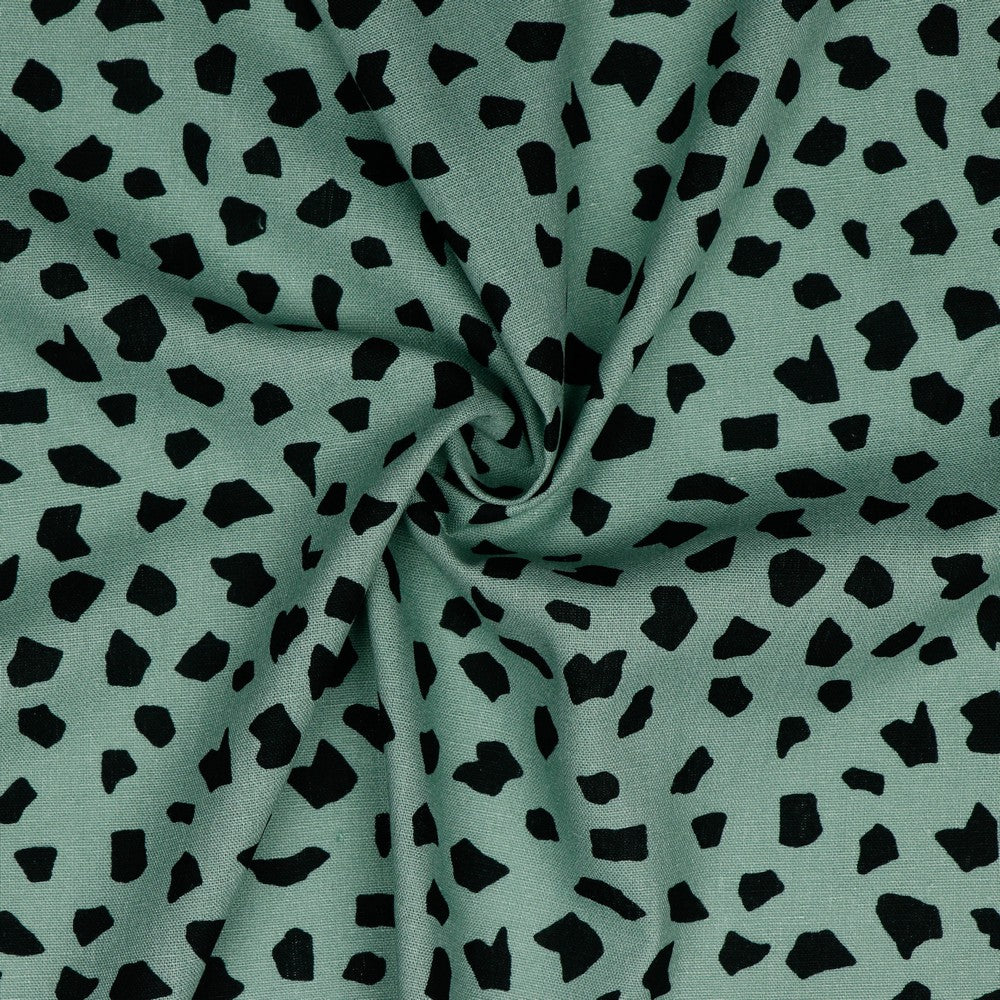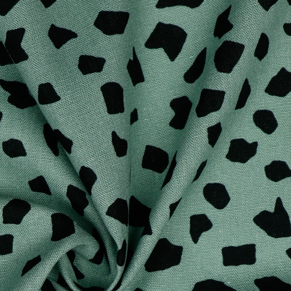 This modern, playful fabric features an abstract scattered spot design in black on a soft sage green background. The irregular, organic shapes give it a relaxed, contemporary feel that’s easy to wear and style. Made from a 55% linen and 45% viscose blend, this fabric combines the natural texture of linen with the softness and fluidity of viscose. It has a lovely drape with just enough body, making it comfortable to wear while still holding its shape beautifully. Breathable and versatile, it’s perfect for dresses, tops, skirts and relaxed trousers – ideal for effortless, everyday pieces with a modern edge. It would make a perfect Kennie shirt by Style Arc, available on our site.