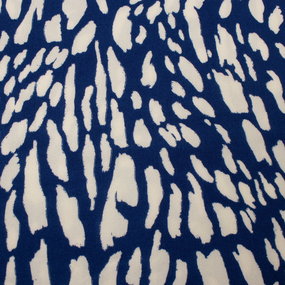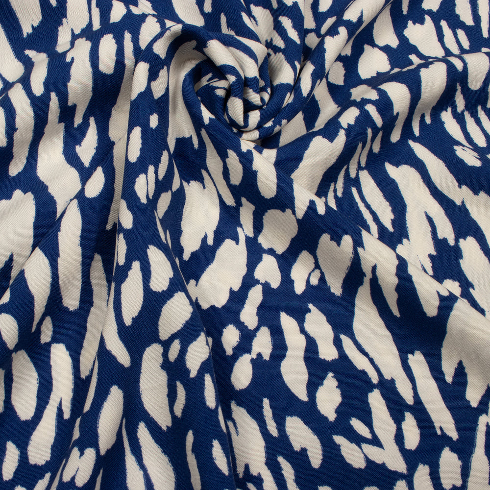 This bold and contemporary fabric features an abstract animal-inspired print in deep royal blue and soft ivory. The fluid, irregular pattern creates a striking, modern look that’s both eye-catching and easy to wear. Made from viscose, this fabric is beautifully soft with a smooth handle and a fluid drape. Lightweight and breathable, it moves effortlessly with the body, making it comfortable to wear throughout the day. It would make an excellent Soho dress by Maison Fauve, available on our site. Perfect for dresses, blouses, skirts and relaxed trousers, this fabric is ideal for creating versatile pieces with a modern edge.