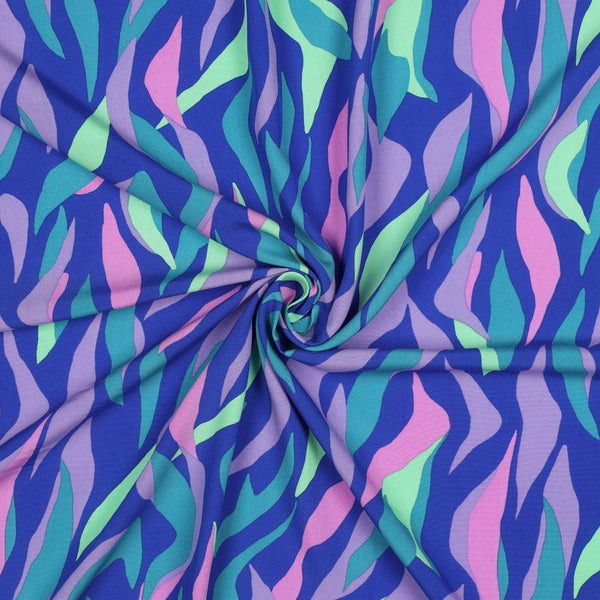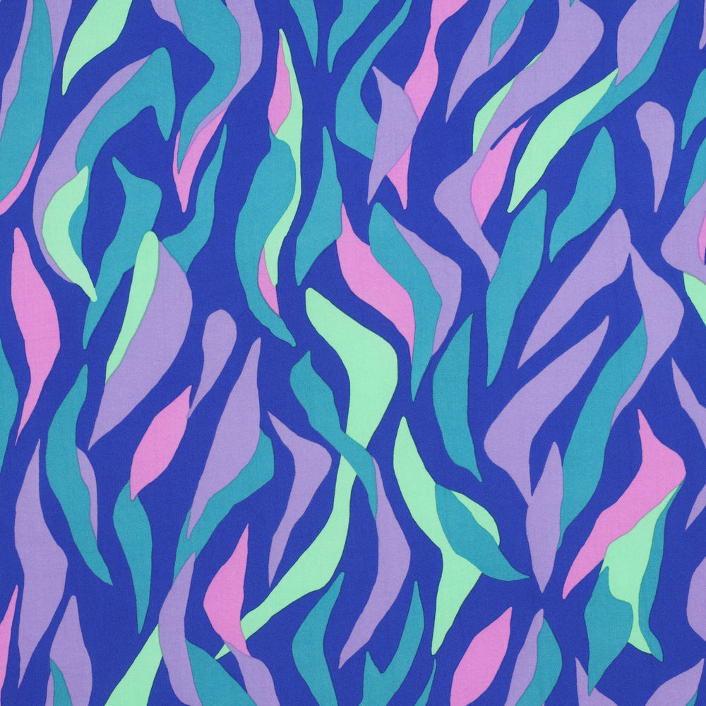 This vibrant printed viscose fabric features an abstract, flowing design in shades of teal, lilac, soft pink and fresh green set against a rich cobalt blue background. The organic, wave-like shapes create a bold yet wearable look, perfect for adding a modern statement to your handmade wardrobe. Made from 100% LENZING™ ECOVERO™ viscose, this fabric is beautifully soft with a fluid drape that skims the body effortlessly. It feels lightweight and breathable, making it ideal for garments you’ll love to wear all year round. Perfect for dresses, blouses, skirts and wide-leg trousers, this fabric lends itself especially well to styles that showcase movement and drape. We think it would sew up beautifully into the Transat dress by Maison Fauve or the Norma blouse by Fibre Mood, both available on our site. LENZING™ ECOVERO™ fibres are derived from sustainably sourced wood pulp and produced using an environmentally responsible process, so you can sew something you love while making a more conscious choice.
