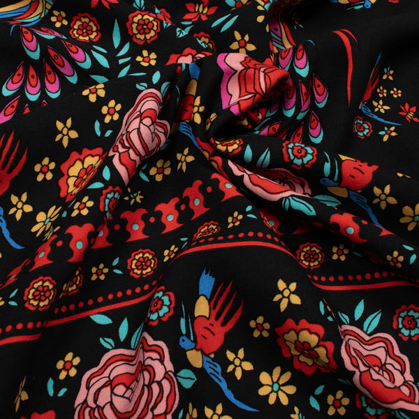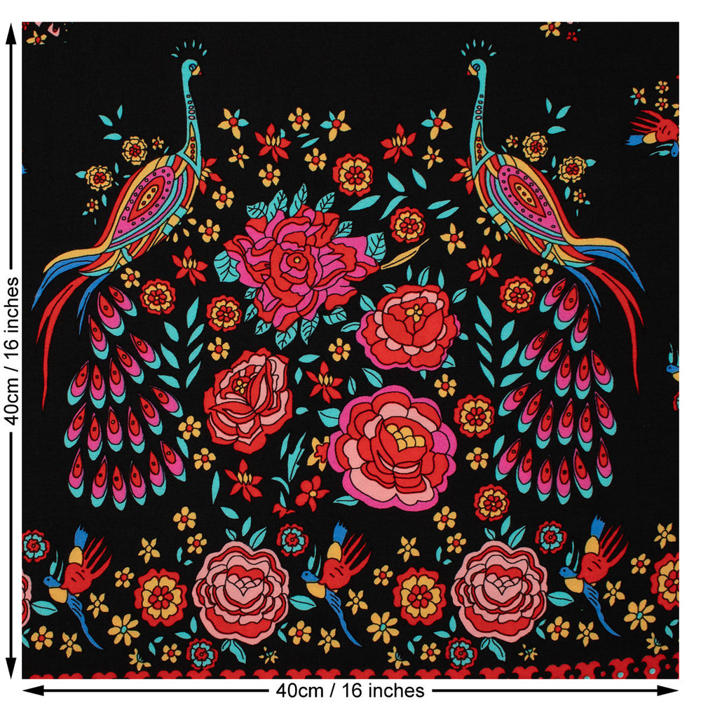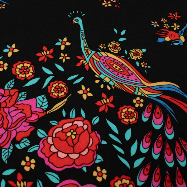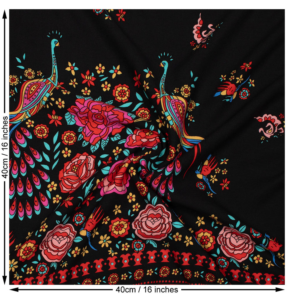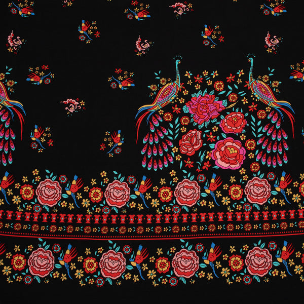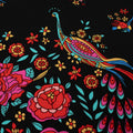 Peacock Border Print Viscose Woven Fabric in Black.