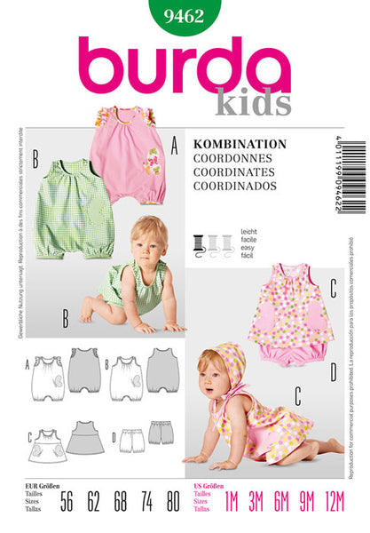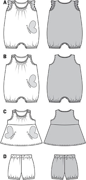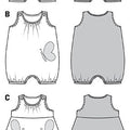 Jumpsuit A and B‚ buttoned at the shoulders‚ either with straps or with sleeve frills. Edged and gathered neck and legs. The panties matching the little dress complete the look.