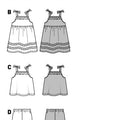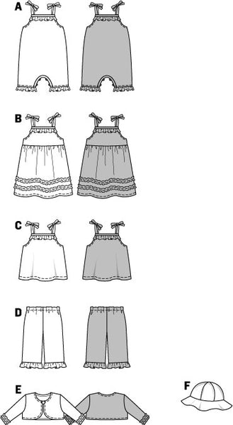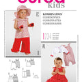A combination for hot summery days: overalls‚ sleeveless dress‚ tank top‚ bungee-cord trousers and bolero. All parts decorated with flounces. The matching hat serves as an excellent protection against the sun.