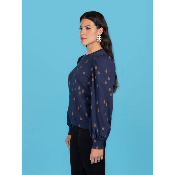 Sweatshirt fleece‚ French terry‚ ponte‚ double knit‚ interlock or sweater knit with at least 10% stretch. N.B. You’ll need a sturdy machine to sew the balloon sleeve version in a thick sweatshirting fabric.