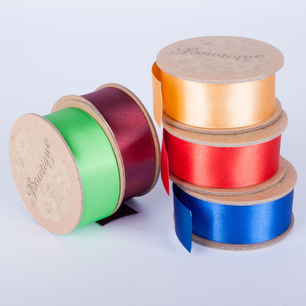 100% polyester with a smooth surface and sheen on both sides. Used for wrapping gift boxes and tying favours for special occasions.