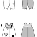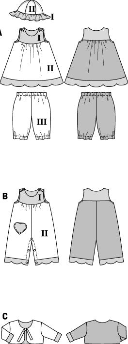 Sleeveless dress A with buttoning at the shoulders‚ with bungee-cord trousers and the fresh ruffled hat. Overall B with practical leg closure and jacket C for colder days.