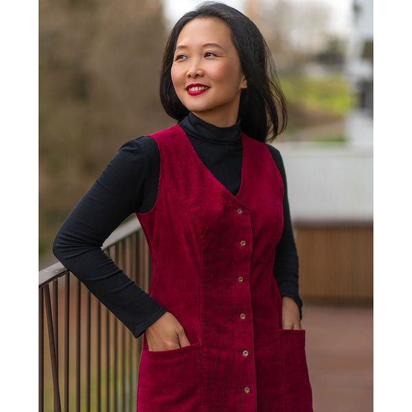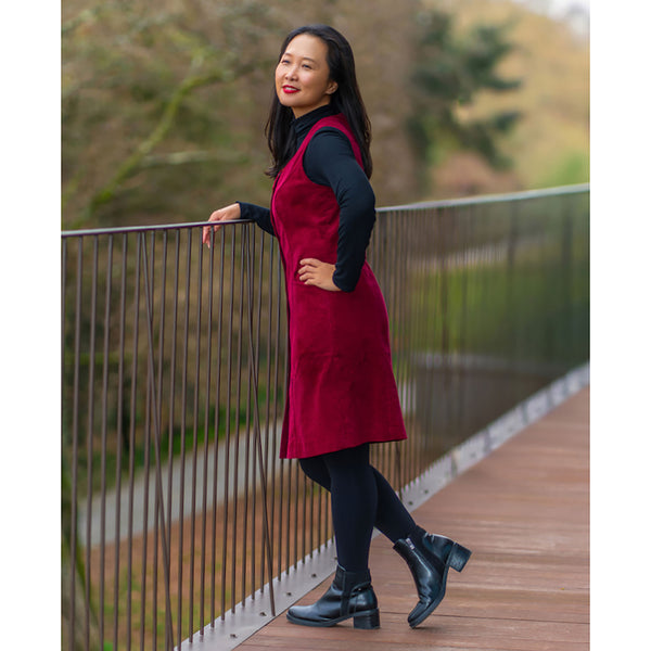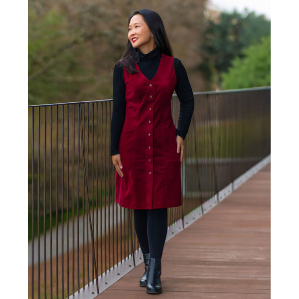 The Elmstead Pinafore is a versatile wardrobe staple designed to be worn over a shirt, turtleneck, or t-shirt - whether short sleeve, long sleeve, or sleeveless. Its classic silhouette works beautifully in a variety of fabrics: corduroy for a traditional look, denim for casual wear, or woolen for a slightly dressier style. Perfect for spring or transitional weather, this pinafore combines comfort with a graceful, flattering fit.
