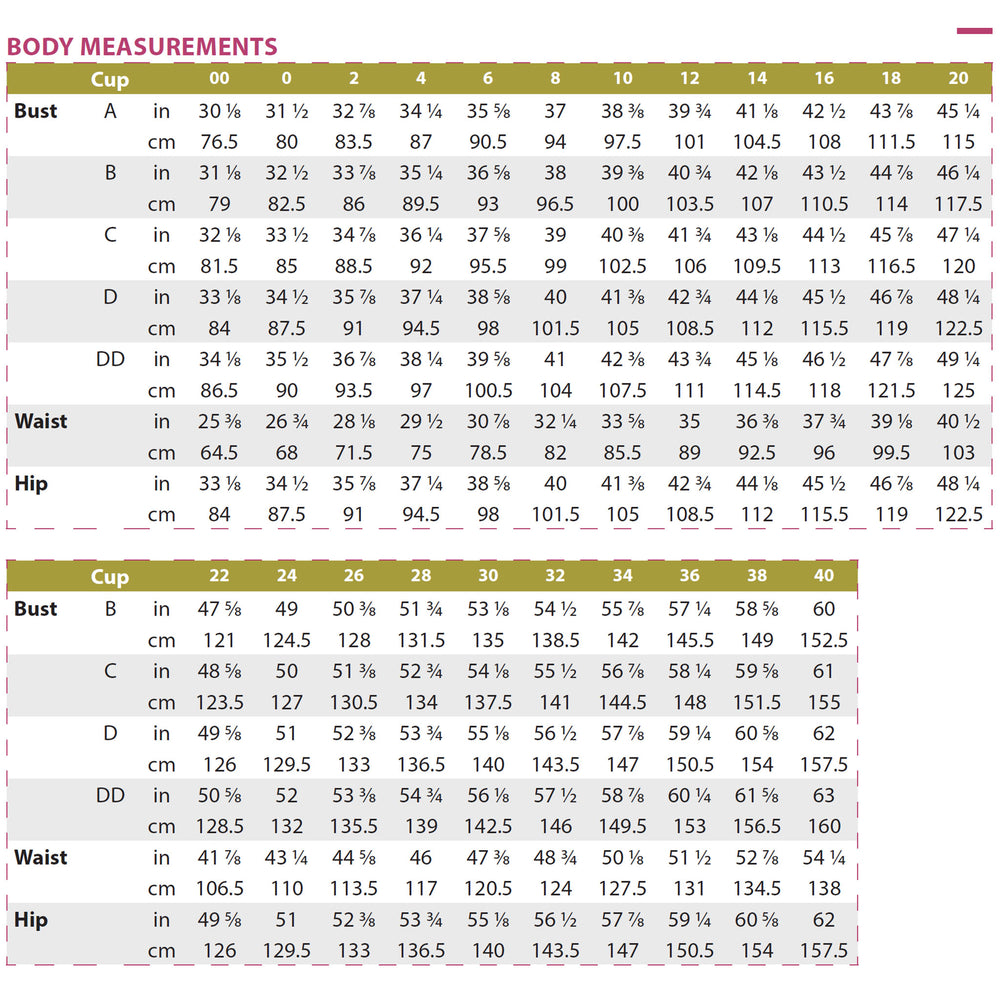Once you've identified your cup size‚ simply check the size chart in the image gallery. Select your bust size from the correct cup size row‚ then choose your waist and hip measurements as usual.