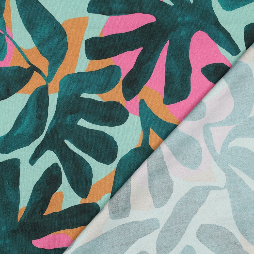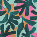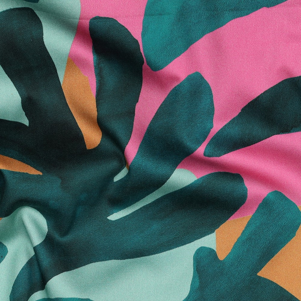This bold and contemporary cotton satin fabric features an oversized abstract leaf design in deep teal, set against a soft mint background with pops of warm peach and vibrant pink. The painterly style gives it a modern, artistic feel that makes a real statement. Made from 100% cotton satin, this fabric has a smooth, soft handle with a subtle sheen and a gentle drape. It feels comfortable against the skin while still offering enough structure for a wide range of garments. Perfect for dresses, skirts, blouses and statement shirts, this fabric is ideal for designs that let the print shine. It would make a brilliant Roscoe blouse by True Bias or Palma top by Maison Fauve, available on our site. Certified to OEKO-TEX® Standard 100, this fabric has been tested for harmful substances, giving you confidence in both its quality and safety.