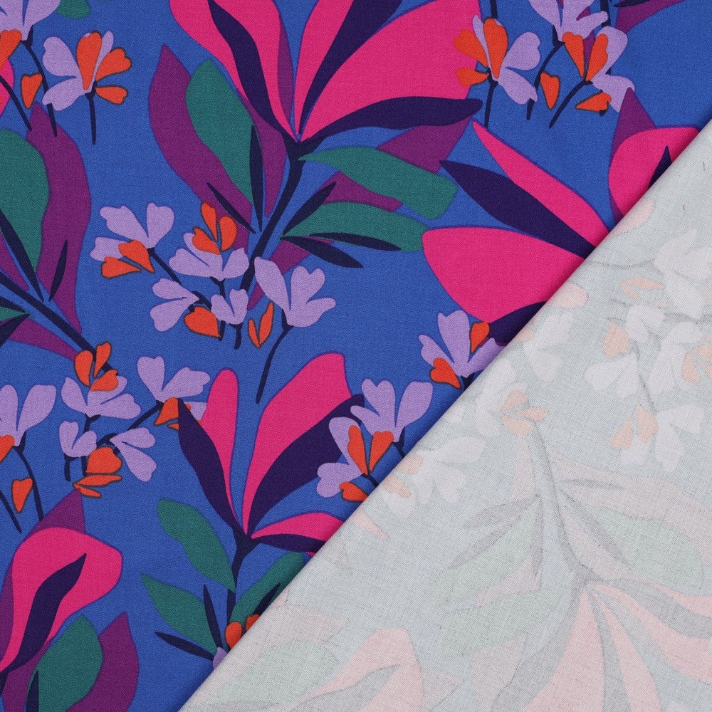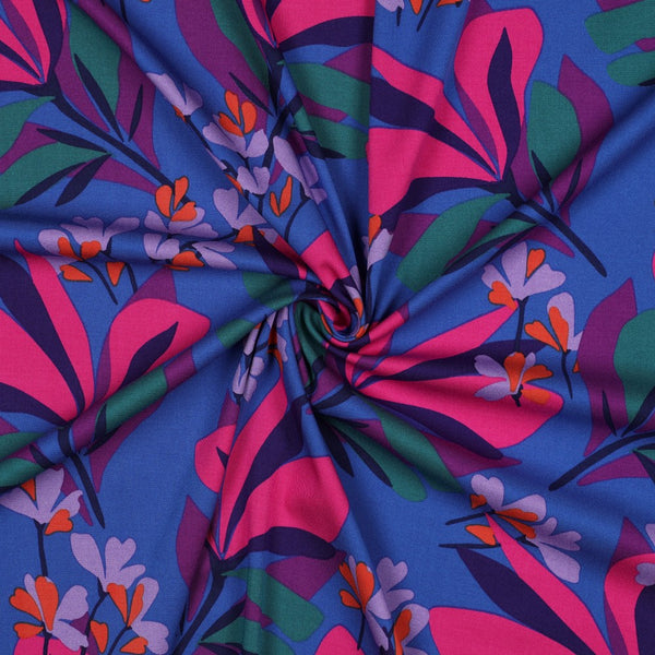 This beautiful Viscose fabric has a small percentage of elastane giving it a slight stretch, although it is a woven fabric. It also has good drape and movement and we cannot get enough of the vibrant floral print, royal blue with splashes of fuschia, lilac, orange and green. It is a medium weight, not a flimsy viscose and would sew up beautifully into tops, dresses, skirts and blouses. We think it’s the perfect match for the Tessuti Lois dress also available on our site.