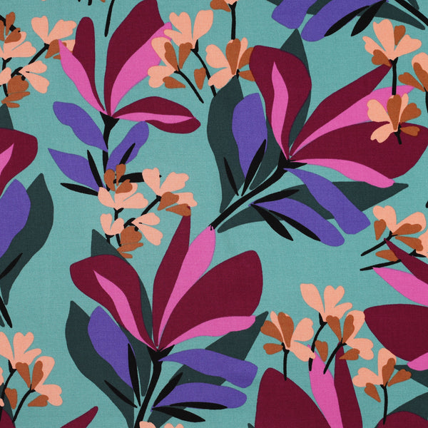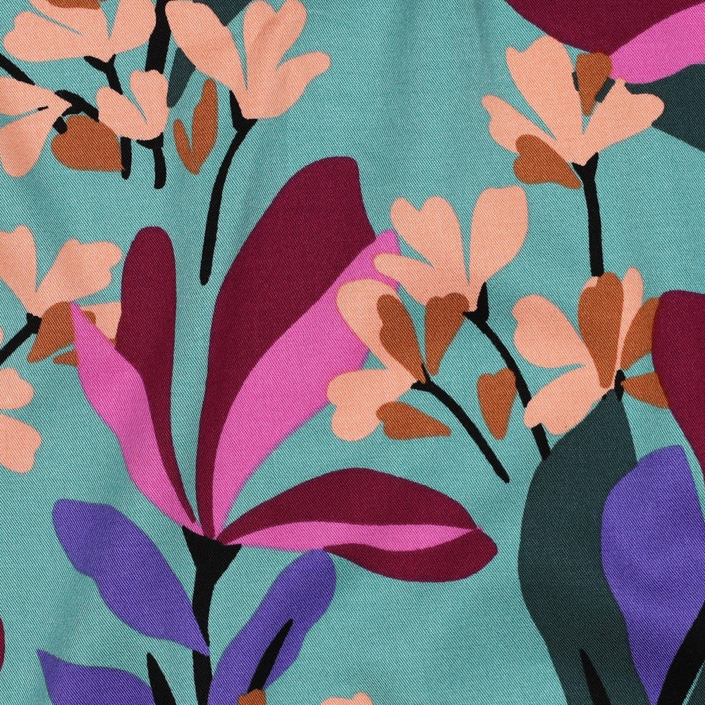 This beautiful Viscose fabric has a small percentage of elastane giving it a slight stretch, although it is a woven fabric. It also has good drape and movement and we cannot get enough of the vibrant floral print, pale green with splashes of wine, pink, purple and darker greens. It is a medium weight, not a flimsy viscose and would sew up beautifully into tops, dresses, skirts and blouses. We think it’s the perfect match for the Tessuti Lois dress also available on our site.