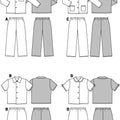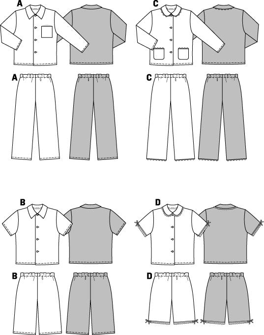 Pyjama with bungee-cord trousers and buttoned shirt. AC with long trousers and long sleeves‚ BD with shorts and short sleeves. With square collar for boys. Peter Pan collar for girls.