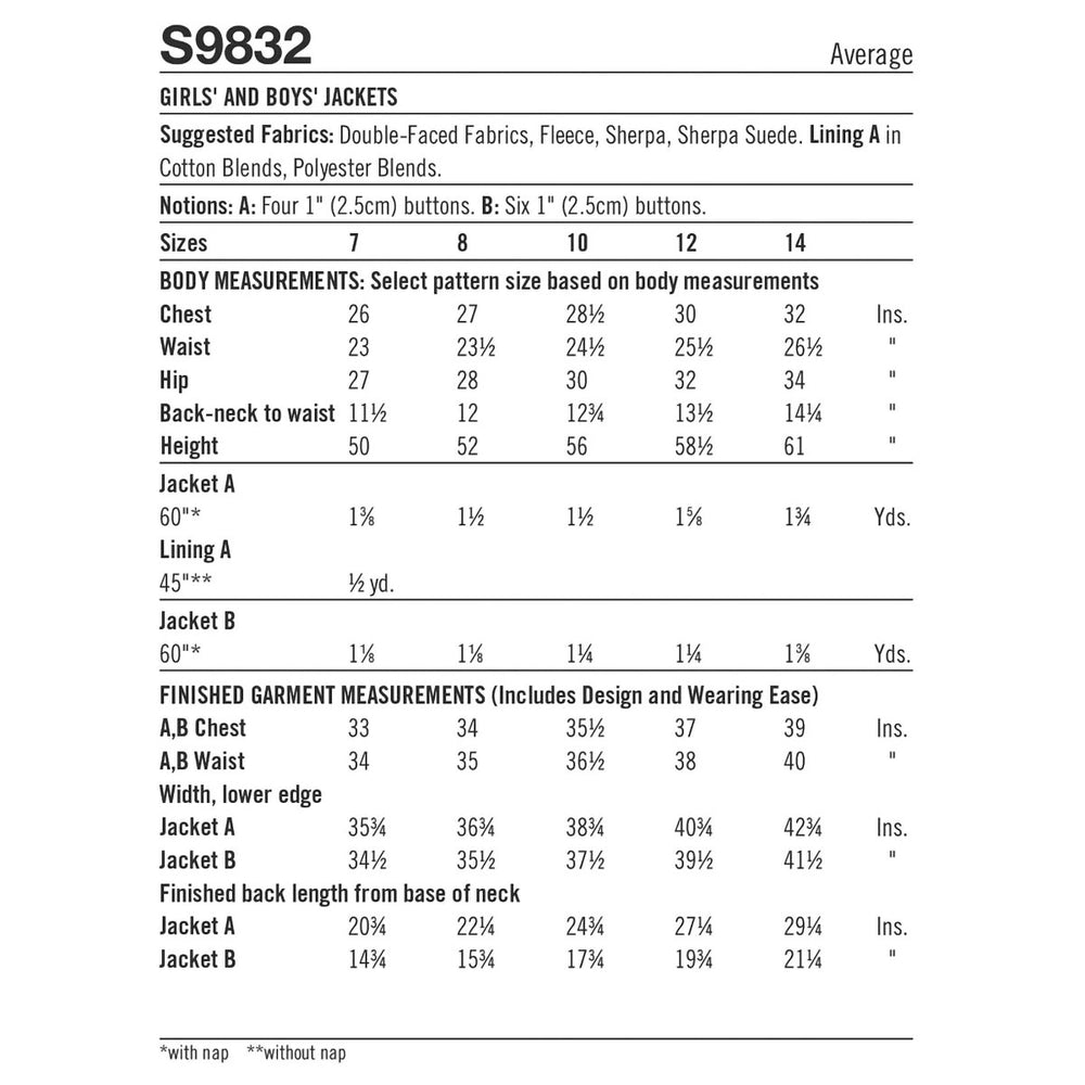 Hooded double breasted jacket in two lengths for boys and girls aged 7 to 14 with dropped shoulders is intended for double-faced fabrics only. View A has pockets.