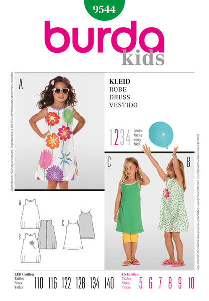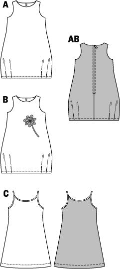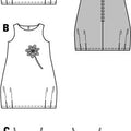 Dress AB in the trendy boule style with stitched folds at the hem. The snappy jersey dress C with contrasting colours and trimmed edges look great with leggings.