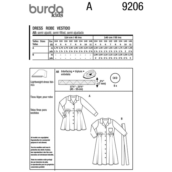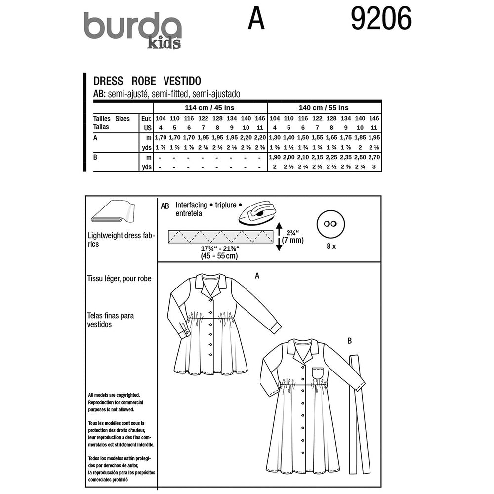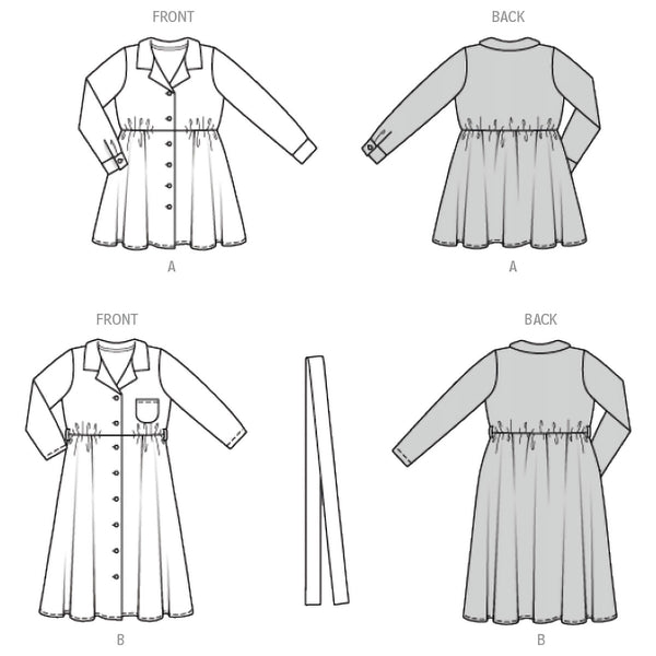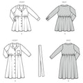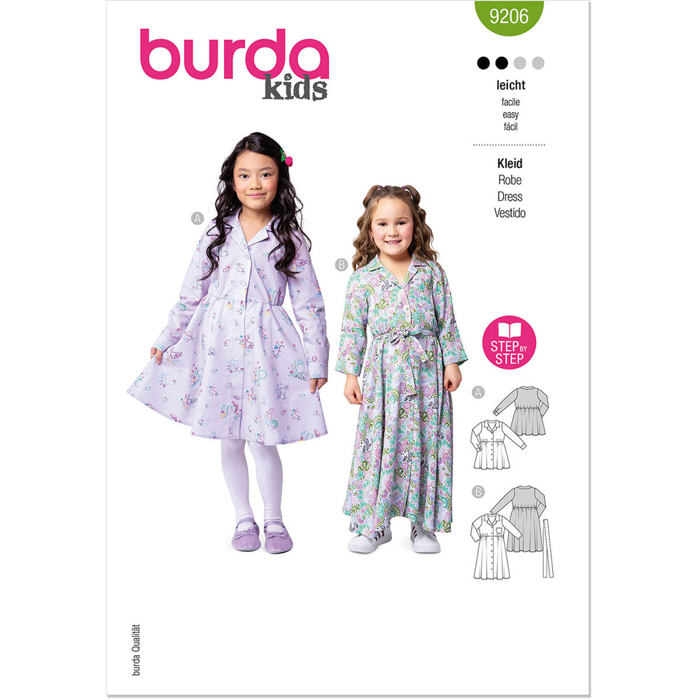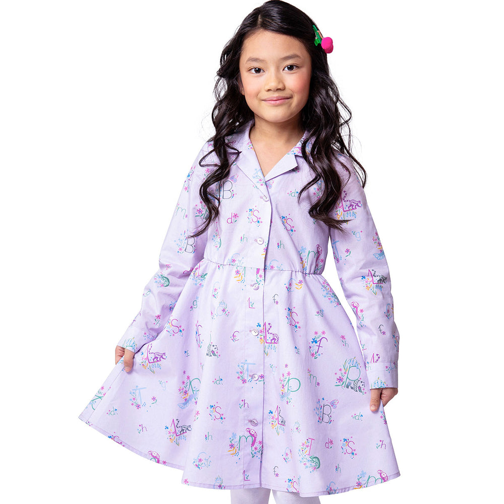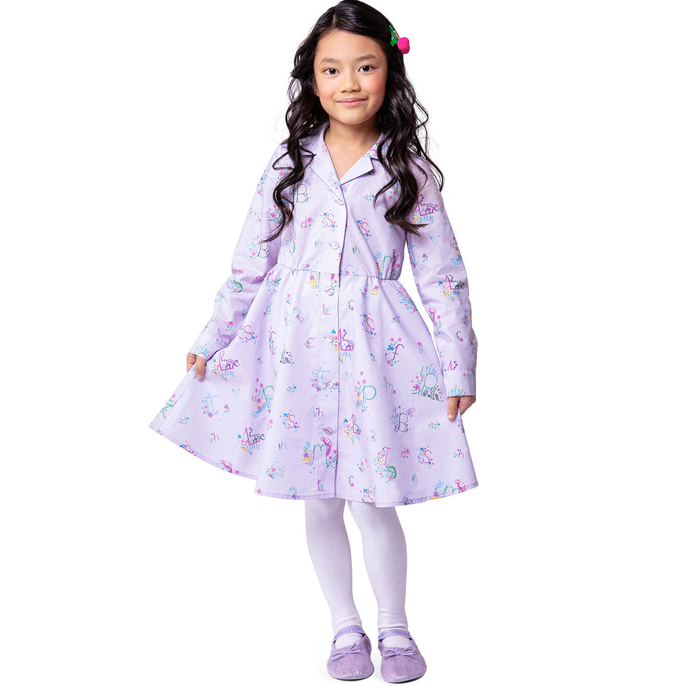 These two patterns for children's dresses are perfect for beginners! The first pattern shows a cool maxi dress with an asymmetrical pocket and tie belt - a great choice for summer. The second pattern is an adorable shirt dress with an ABC print and charming details such as a small lapel collar and cuffed sleeves. Easy to sew and absolutely popular!