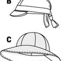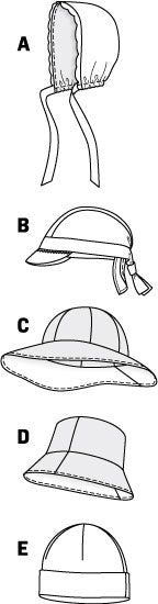 Bonnet A and baseball cap B for babies and toddlers. Hats C‚D and cap E for kids. Quick and easy to sew for colder days or as a shelter from the sun. A‚B: 15‚16-1/2‚ 18-1/8‚ 19". C‚D‚E: 19-3/4‚20-1/2‚21-1/4".