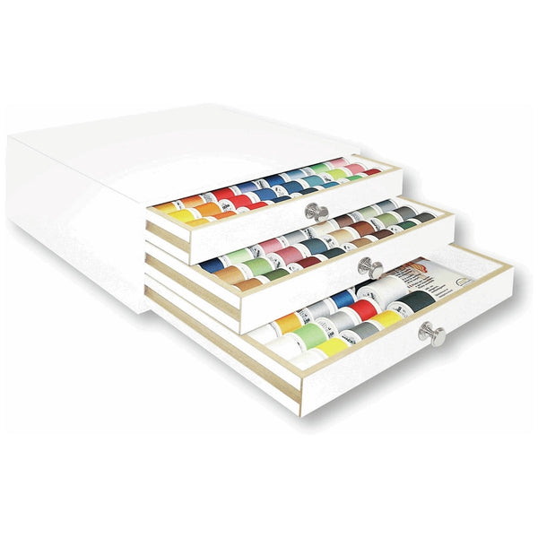 White box with pewter colour pulls containing 182 x 100m Aerofil 120; 12 x 100m Aerofil 35. High quality 100% polyester core spun‚ extra strong‚ sew-all thread for all fabrics and seams. Dimensions of box: (hwd): 14 x 36.5 x 36cm.