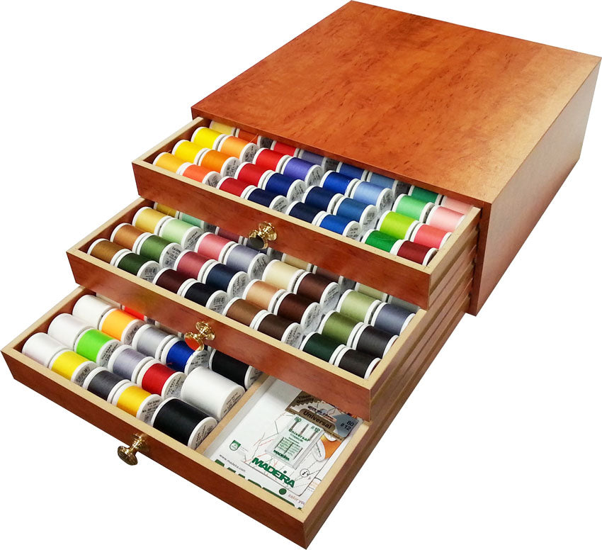 Madeira Treasure Chest. Wood finish. Aerofil Sewing and Quilting Thread.