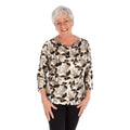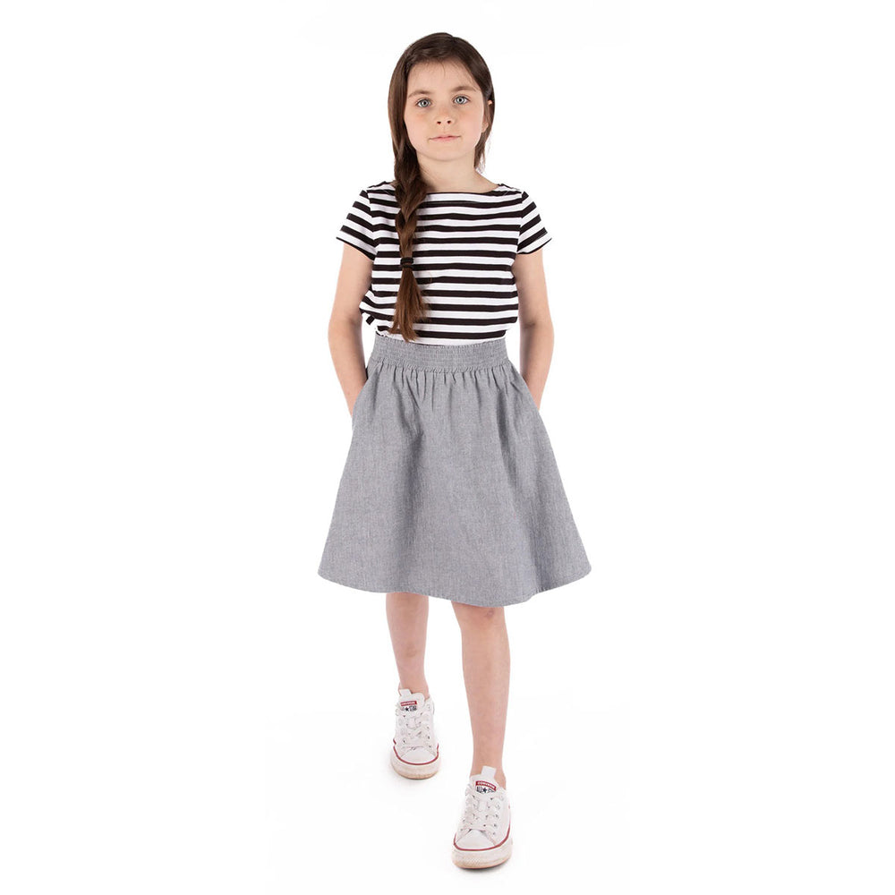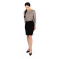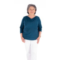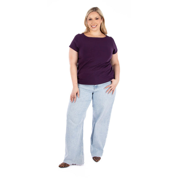 Pattern for a classic semi-fitted t-shirt pattern with two neckline options: boat neck (A) or draped cowl neck (B) (sizes P and up only). Choice of cap or three-quarter sleeves.