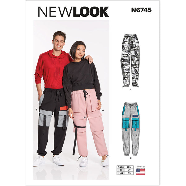 Unisex cargo trousers include bellows pocket with flap and drawstring at waistband. View A has front patch pockets‚ flat webbing with plastic parachute clip‚ and cord stoppers at the bottom of Trousers. View B has side seam pockets‚ patch on front‚ and nylon webbing plastic snap buckles.
