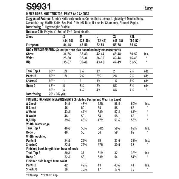 Comfy and stylish‚ create this easy to sew lounge set for Men. Pattern includes robe‚ tank top‚ trousers and shorts. Oversized fit robe has dropped shoulder sleeves and belt. Pull-on trousers and shorts have elastic waistband and side pockets.