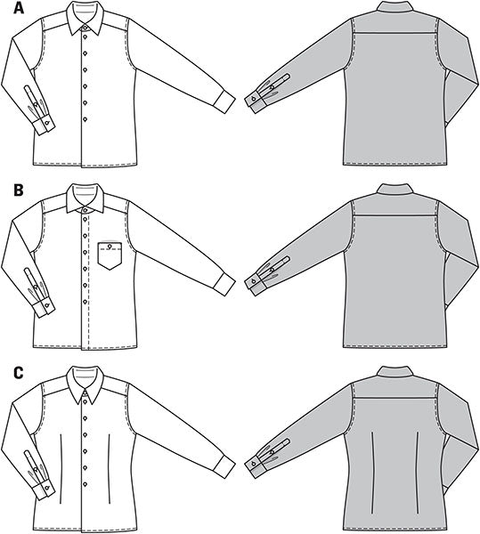 Hip shirts‚ A and B moderately wide cut‚ C fit to the figure with darts. The collars make all the difference‚ you can choose between a Windsor collar‚ a shark collar and a button-down collar.