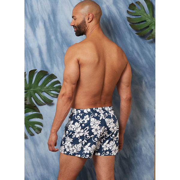 View A has fly front zip closing‚ flap pocket and elastic back and side seam pockets. View B has contrast purchased bias binding and elastic waist. Views A and B have fitted lining with elastic at leg openings. View C has lining‚ elastic at leg openings and elastic waist with drawstring. View D has stitched hems.