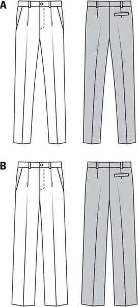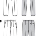 Two variants with differently wide legs. Both versions with transverse pockets‚ one waistband pleat and one seat pocket. Trousers A with legs tapering towards the hem. B with full‚ straight legs.