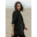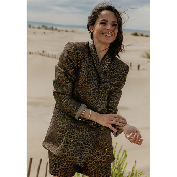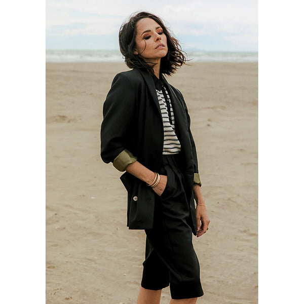 Effortlessly elegant‚ the Mimosa blazer is the highlight of the Fauve Romance collection. Its straight cut is well constructed with 2-part sleeves‚ a small side‚ a false piped welt breast pocket and very large rounded patch pockets the design of which is reminiscent of a shawl collar and softens the slightly boyish look of this jacket with its reworked volume and marked shoulders.