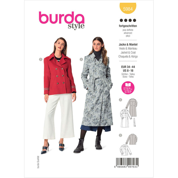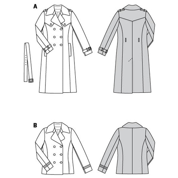 Two classic styles (both lined) will bring you joy for years to come. The trench coat with generous lapels and a belt can also be made up in classic beige or navy. The gold buttons and band details on the caban jacket lend it a maritime touch.
