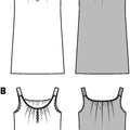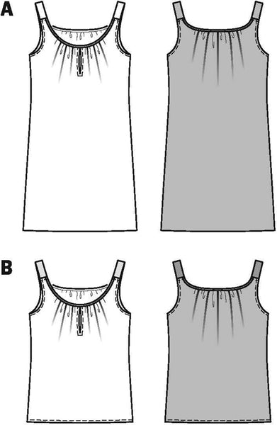 Wonderfully airy‚ softly draping pinafore dress or strap top for hot summer days. The unobtrusive gathers at the neck are held in place by binding edges. The straps of top B are simply made of fancy braid.