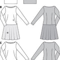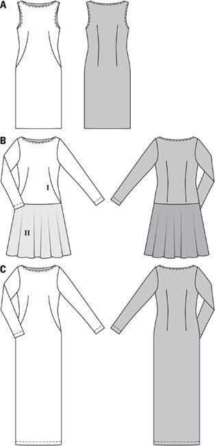Slimline or gently flared skirt from the hips : The appeal of these charming jersey dresses with flat bateau neck lies in their attractive sillhouettes with curved darts.