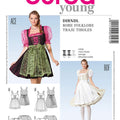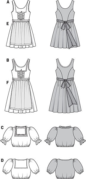 Smart dirndl dresses‚ showing the characteristics of their kind: square décolleté and fancy lacing‚ gathered‚ wide skirts (A short‚ B covering the knee)‚ short dirndl blouses with puff sleeves and aprons.
