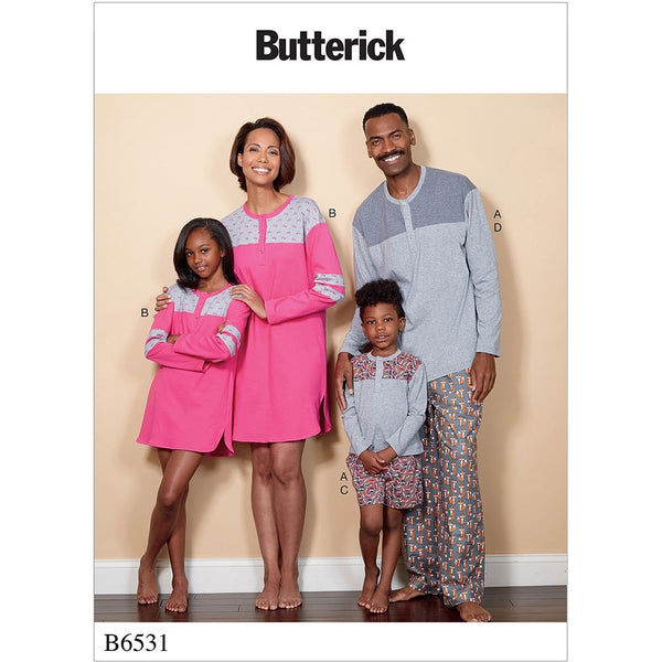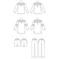 Loose fitting pullover top and tunic have front placket with snap closures‚ contrast front and back yoke‚ and back pleated into yoke. B: Contrast sleeve bands‚ shaped hemline. Loose fitting straight leg trousers and shorts have elastic waist.