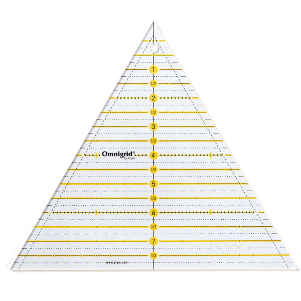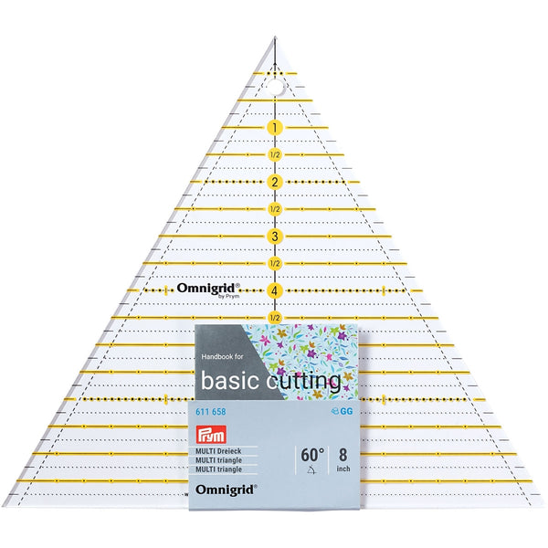 The Omnigrid® special ruler is ideal for all 30 degree and 60 degree pattern pieces in patchwork projects. The sturdy plastic triangular ruler is easy to manipulate and is therefore an indispensable aid both for beginners and for experts in measuring and cutting triangles‚ half triangles‚ lozenges‚ trapeziums and hexagons. The measurements are clearly marked in centimetres and inches‚ which makes it easy to use. Full instruction book included showing basic cutting techniques.