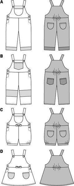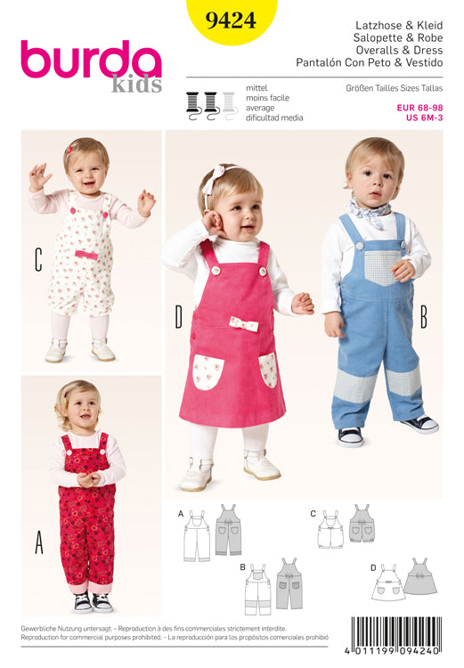 Overalls and Pinafore Dress Burda Sewing Pattern No. 9424. Size 6m to 3y.