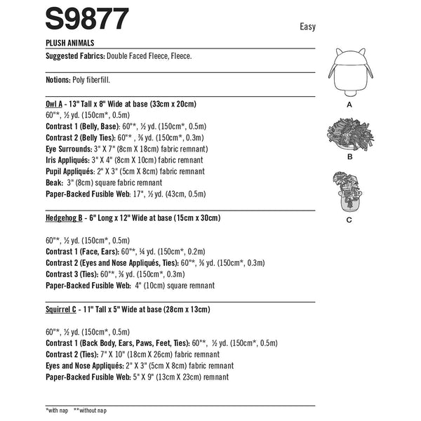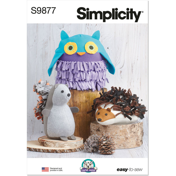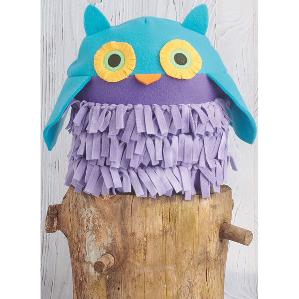 Playful woodland easy to sew plushies are crafted from fleece fabrics with tied fringe details. Owl has layered eyes‚ dimensional wings and fringed belly. Hedgehog has appliqued eyes‚ nose and fringed back. Squirrel has dimensional arms‚ feet and ears‚ appliqued eyes and nose and fringed tail.