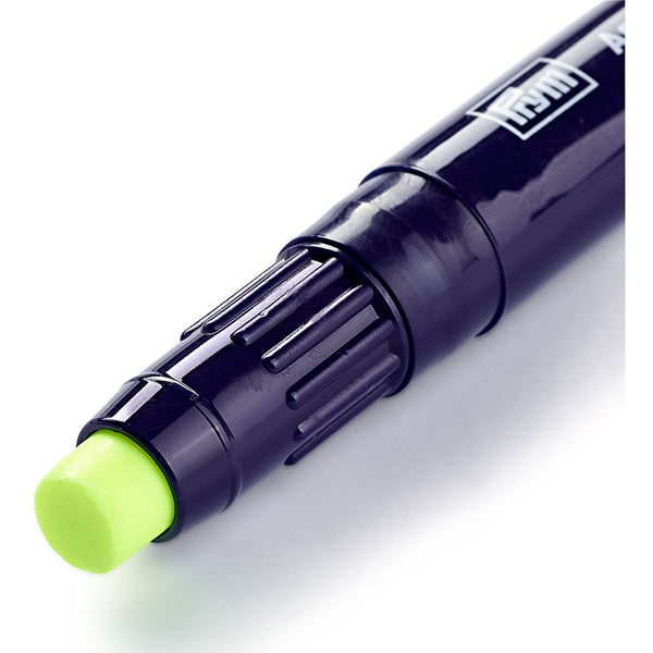 The Aqua glue marker from Prym is suitable for securing braids‚ laces and zip fasteners before sewing them in place. Two lengths of fabric can also be stuck together in the twinkling of an eye and guided through the machine without folding or rucking. There is a cartridge containing yellow pigmented textile glue inside the glue stick; this yellow colouring is no longer visible once the glue has dried. Washing the fabric dissolves the glue completely without leaving traces.
