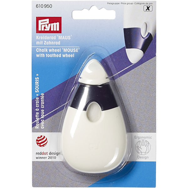 The chalk wheel "Mouse" from the Prym.ergonomics series is ideal for freehand marking on all types of fabrics. The fine gear at the top of the mouse shaped chalk wheel leaves a clearly visible fine chalk line‚ which can be removed easily by brushing or washing. The level of chalk in the cartridge can always be seen through a window. Replacement chalk cartridges are available. The pleasant-to-hold ergonomic housing of the chalk mouse ensures fatigue free work. A grippy cap reliably closes the chalk wheel. It is no coincidence that this practical chalk wheel was awarded the Red Dot Design Award in 2010.