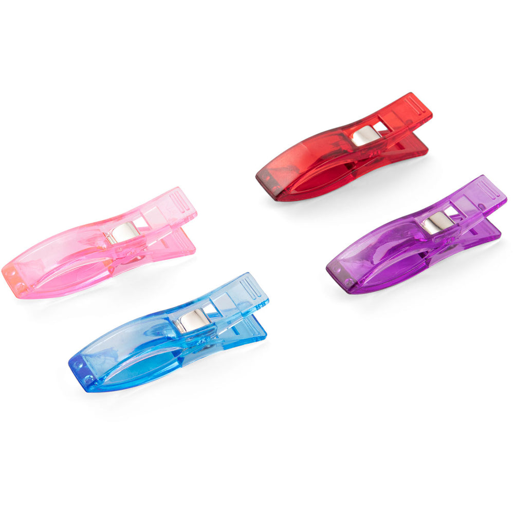 These fabric clips from the Prym Love Series offer a successful alternative to pinning with conventional pins. The high-quality plastic fabric clips are especially suitable for fabrics‚ on which every pinprick would be permanently visible‚ such as very fine materials like silk. They are also ideal for oilcloth or leather‚ because the fabric clips hold the material simply and quickly‚ without damaging it. They also offer firm support when stapling multiple fabric layers and are ideal aids for affixing quilt edgings. The colourful fabric clips make pinning fabrics even more fun.