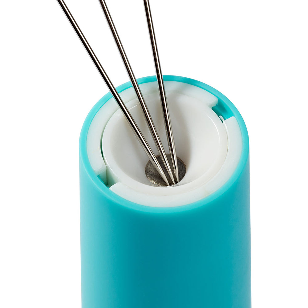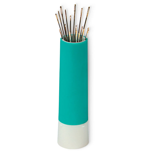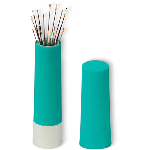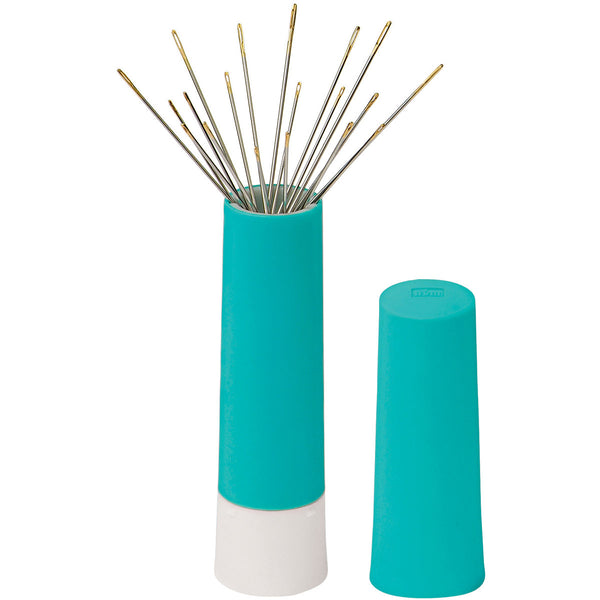 This patented and ergonomically-designed needle twister from the Prym Love collection is an assortment consisting of 19 hand sewing and darning needles with golden eyes. The needles are held by a magnet inside the needle twister. By turning the lower end of the twister‚ the needles can be comfortably screwed and unscrewed. When unscrewing the needles‚ they clearly fan out and can be easily identified and conveniently removed. In this manner‚ the needle twister serves as a mobile storage deposit for all steel needles.