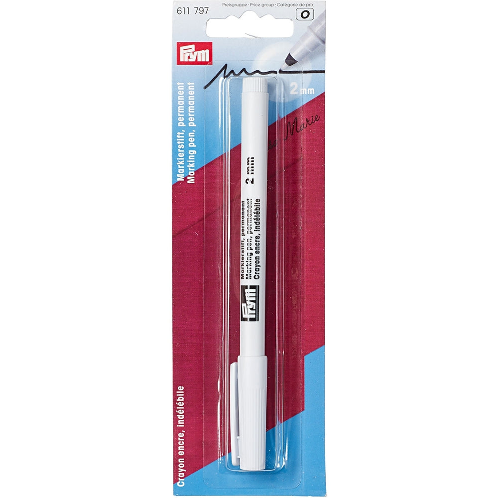 The permanent marking pen from Prym is suitable for tracing markings. The permanent marker‚ a black‚ water-resistant felt-tip pen should be stored with the cartridge tip pointing downwards. With a cartridge thickness of 2 mm it is easy to trace thick lines on lighter-coloured and various coloured fabrics. The fine design of this marking pen is especially suitable for very fine markings and lettering on fabric. It is also possible to mark patterns and stencils with these water-resistant permanent markers without problems.