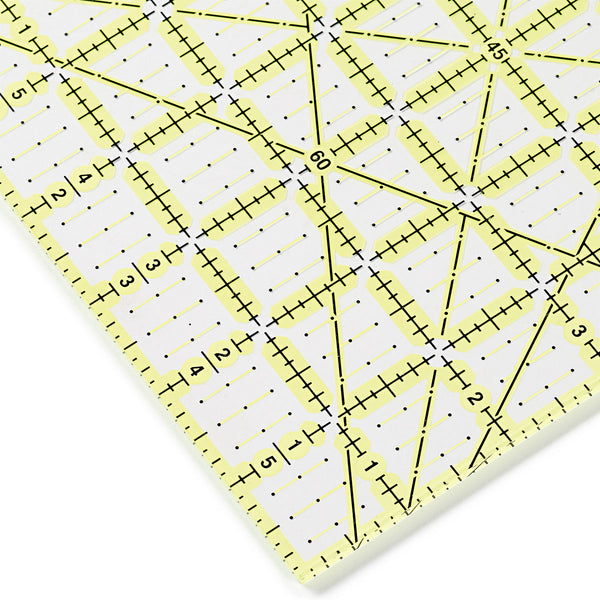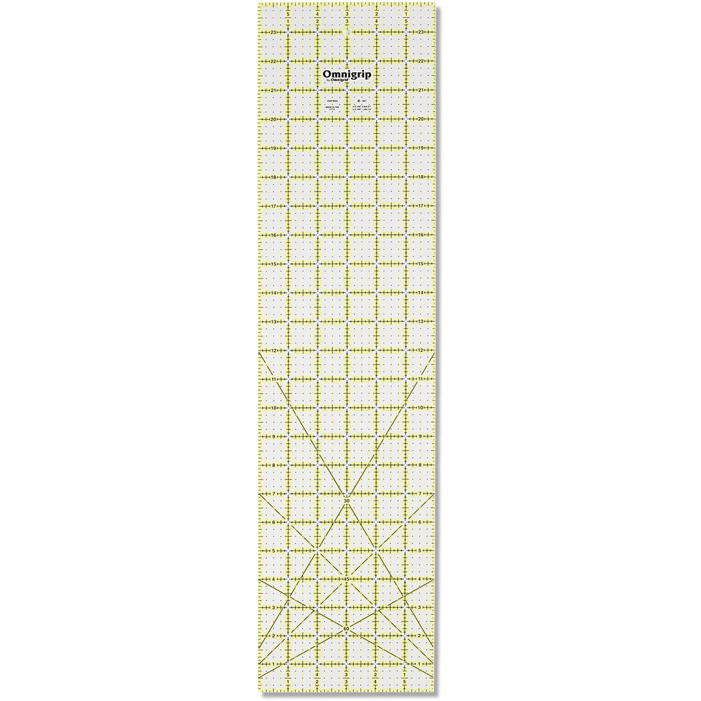Meet Omnigrip‚ the non-slip‚ patented Omnigrid patchwork ruler from Prym. It is available in various sizes with an inch scale. The special green colour of the markings on the underside stops the ruler from sliding on the fabric‚ which provides greater safety in guiding the rotary cutter along the ruler. As with all Omnigrid rulers the scratch-resistant laser print on the underside of the ruler prevents visual distortion. The detailed marking of the scale in eighths of an inch and the 30‚ 45 and 60 degree angle markings make this ruler an indispensable aid to sewing and quilting‚ when using an inch scale.