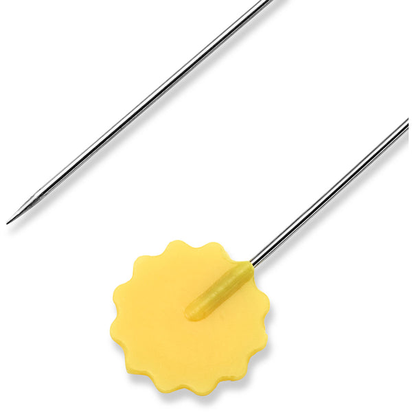 These long pins are equipped with a flat‚ flower-shaped head made of heat-resistant‚ yellow plastic and are specially tailored to the needs of patchwork and quilt work. This highly-stable connection between the stem and head for high stress and even. Its fine tip easily penetrates several layers of fabric without damaging the fibres. The pins’ flat heads even let you easily iron over them.