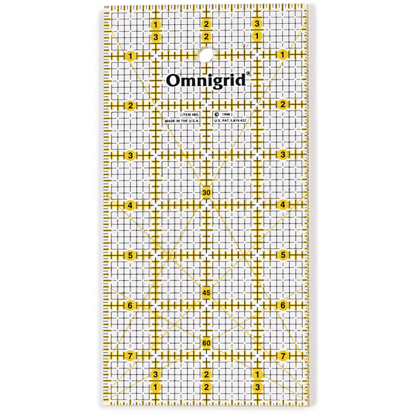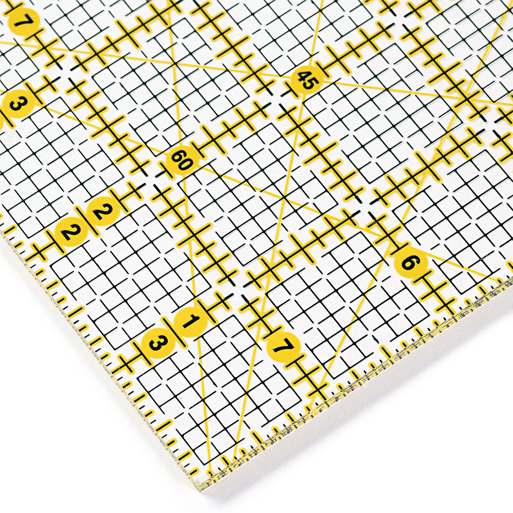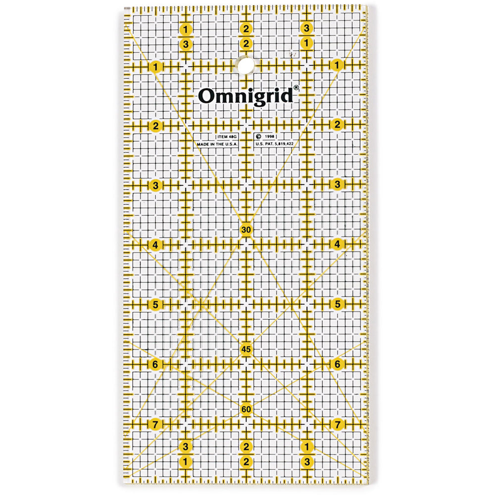 Whether on the cutting table or the sewing machine: the Omnigrid universal rulers from Prym are indispensable companions for patchwork‚ dressmaking and tailoring or for graphic work. The yellow and black grid markings in an inch scale make it possible to mark accurately on both dark and light fabrics. The scratch-resistant laser print on the underside of the ruler prevents visual distortion. Thick‚ resistant‚ durable material guarantees safe guiding of rotary cutters and art knives on the cutting mat. To keep things tidy‚ it can be hung up by its eyelet.