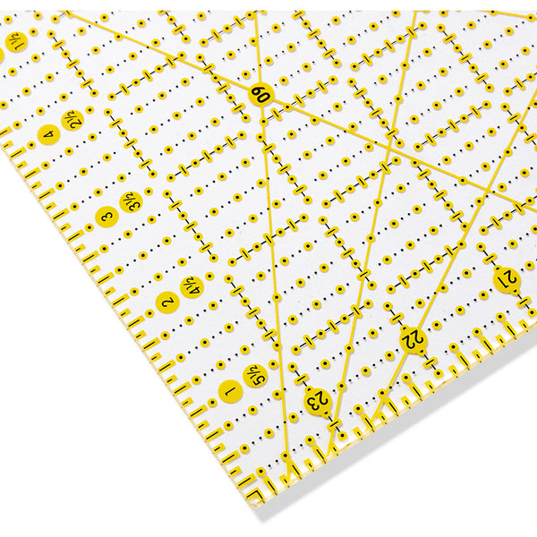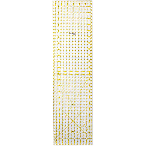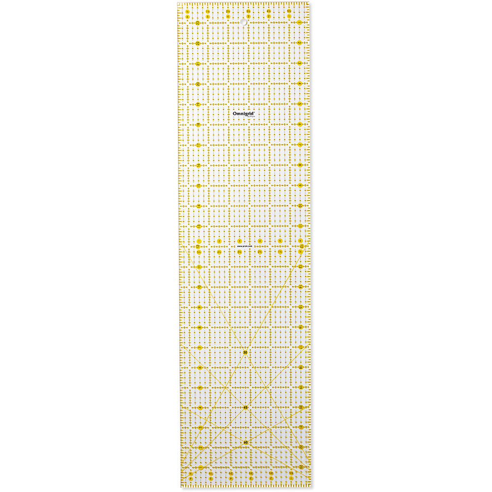 Whether on the cutting table or the sewing machine the Omnigrid universal rulers from Prym are indispensable companions for patchwork‚ dressmaking and tailoring or for graphic work. The yellow and black grid markings in an inch scale make it possible to mark accurately on both dark and light fabrics. The scratch-resistant laser print on the underside of the ruler prevents visual distortion. Thick‚ resistant‚ durable material guarantees safe guiding of rotary cutters and art knives on the cutting mat. To keep things tidy‚ it can be hung up by its eyelet.